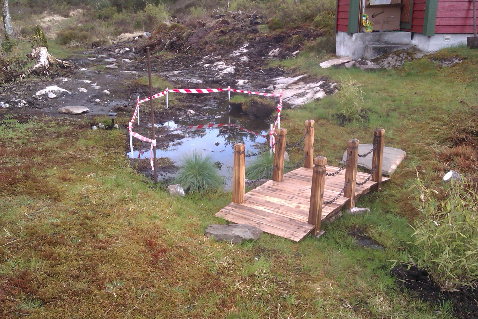 Der absolute Hingucker ist die kleine Gartenbrücke, die als Verbindung zwischen dem Gästehaus und der Hütte dient, umpflanzt mit zwei Bambus Sträuchern ( werden ca. 3m hoch ) und zwei Blåvingel Büschen, die es sehr feucht mögen. Das ganze wird von mehreren Solarleuchten angestrahlt.