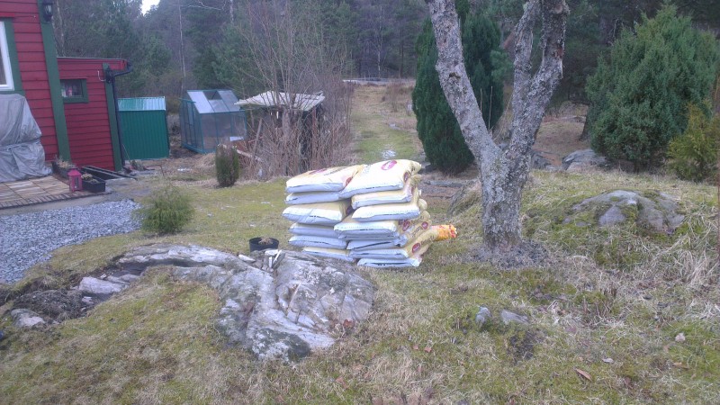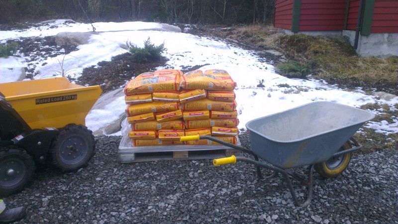 Da wir später auch Mutterboden ( Oberboden ) brauchen und der gerade in einem Gartenmarkt im Angebot ist, haben wir dort auch gleich zugeschlagen. Die ersten 15 Säcke sind auf dem Grundstück und warten auf die Weiterverarbeitung.