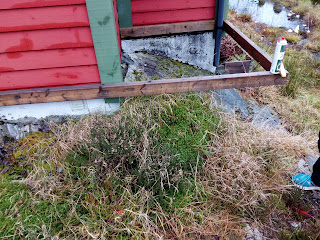 | Hier, zwischen Haus und Holzspeicher kommt die neue Terrasse mit einer Treppe nach oben. |