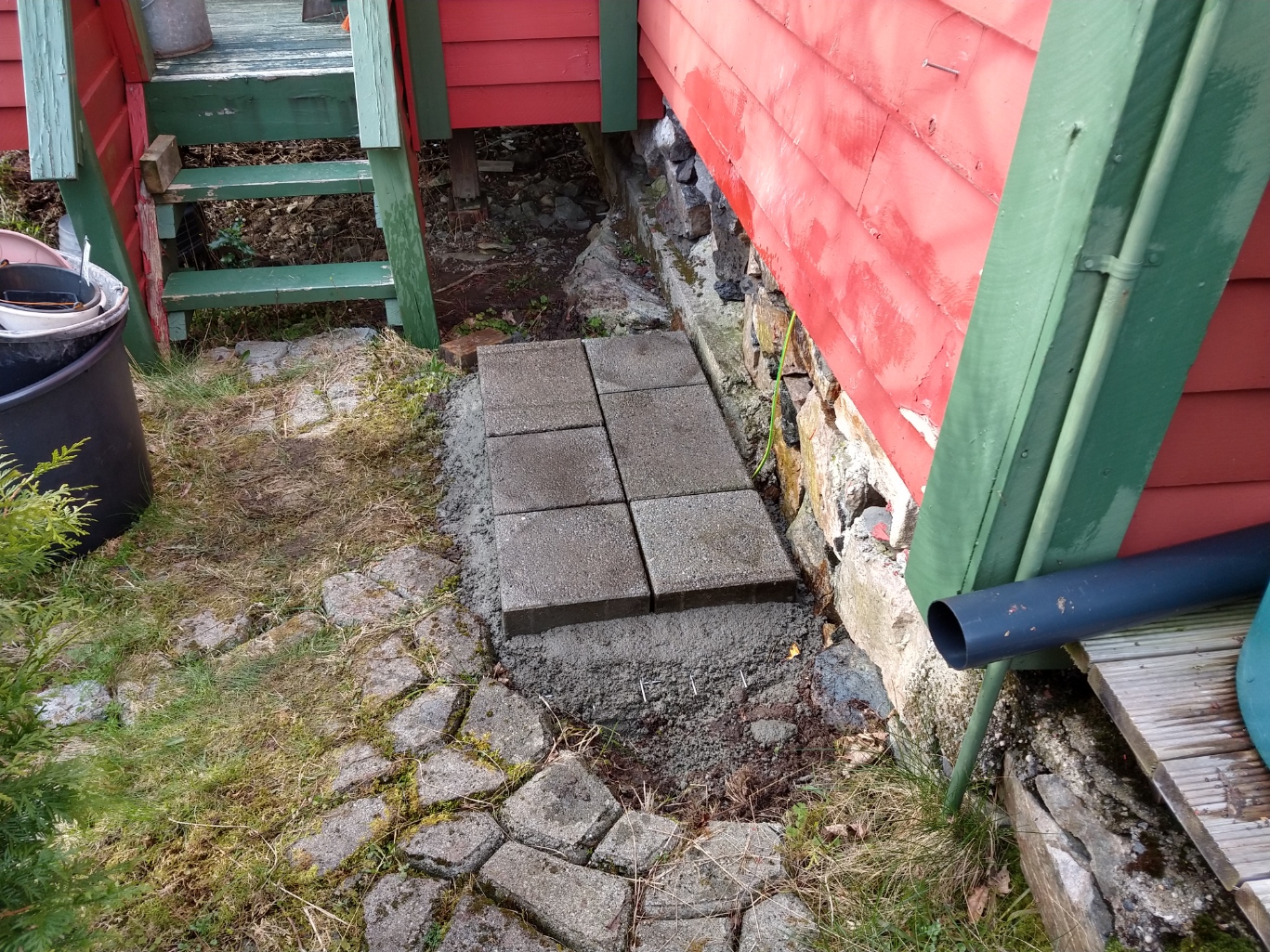 Nachdem wir die alten Pflanzen und den Boden entfernt hatten, haben wir mit dem Beton fundament begonnen. Danach haben wir Gehweg platten für einen sicheren Stand verlegt.